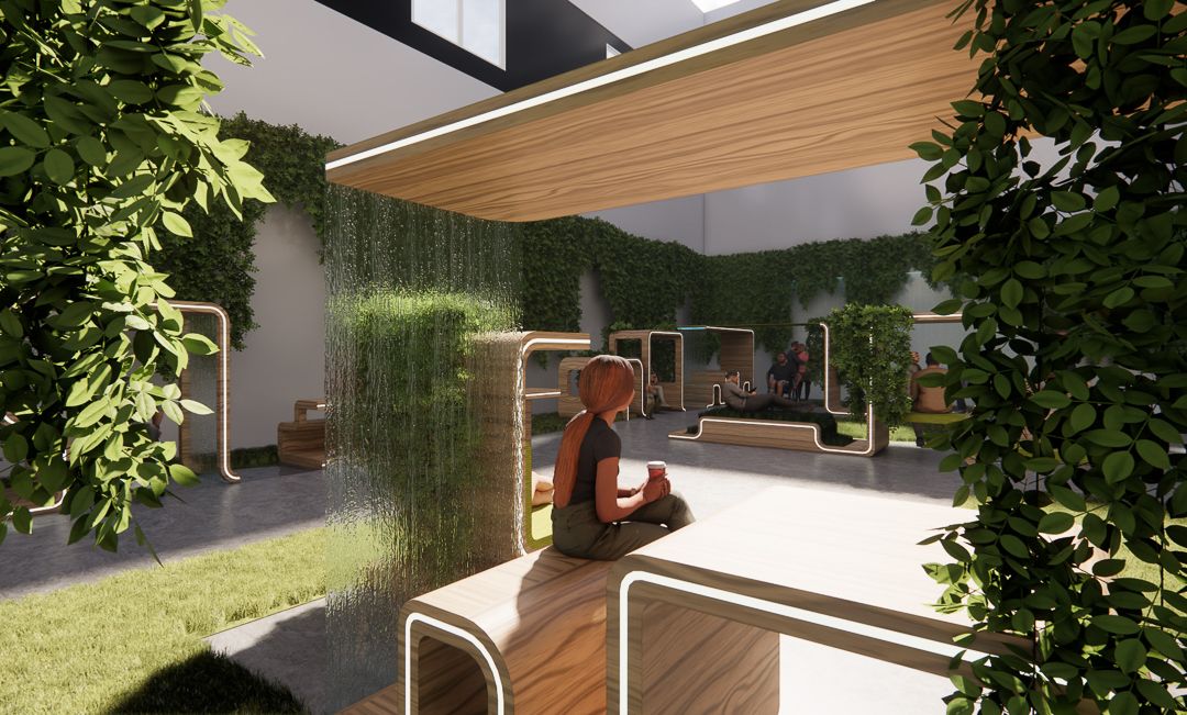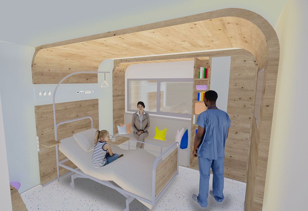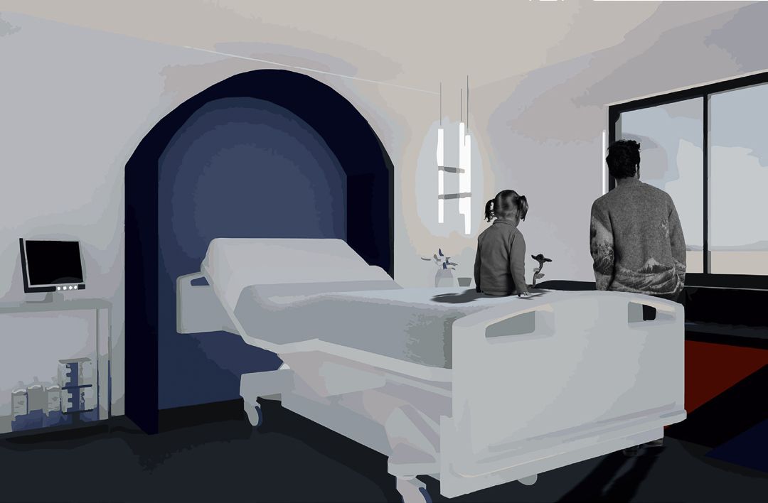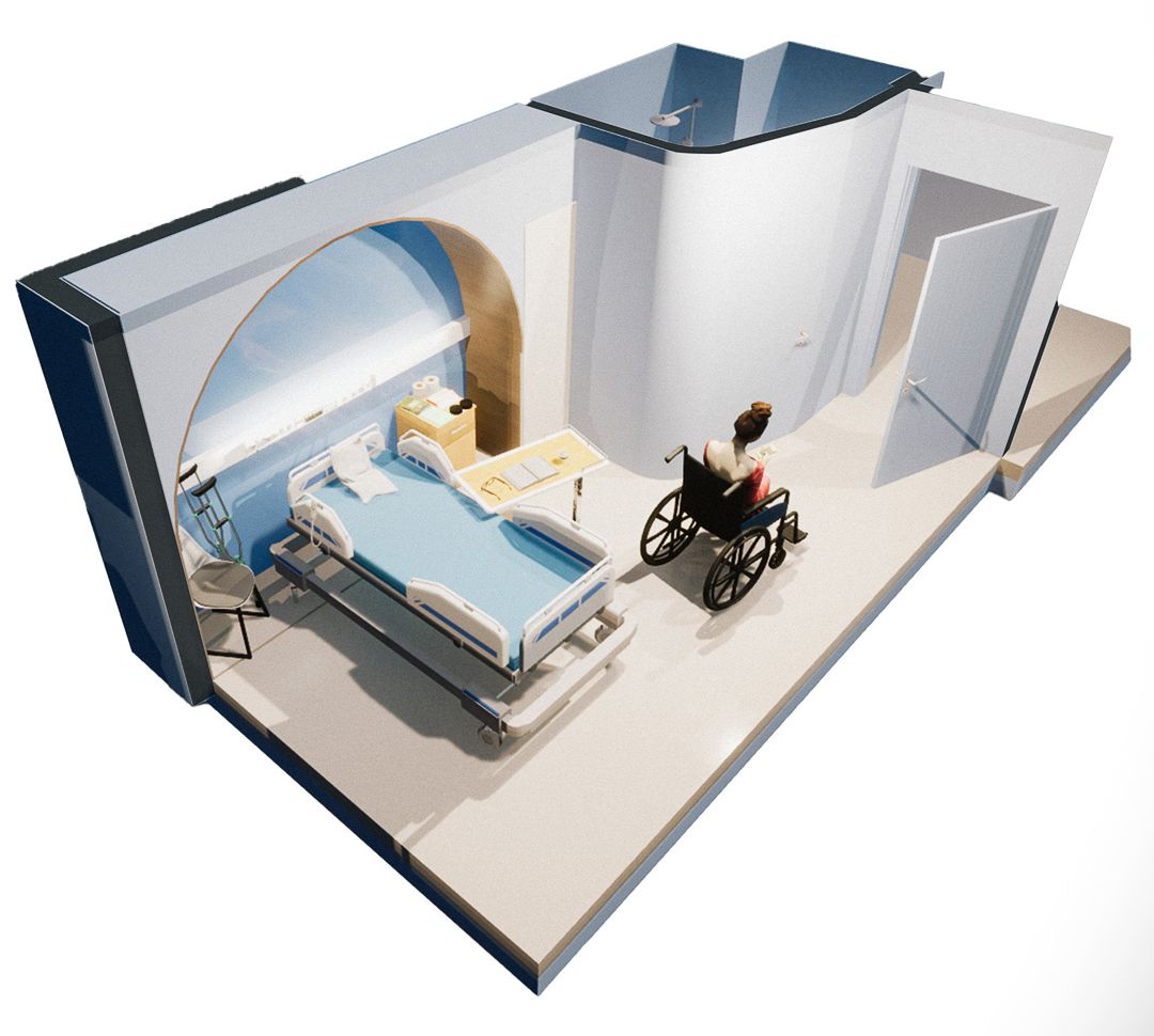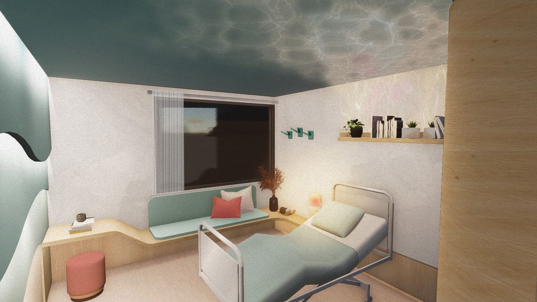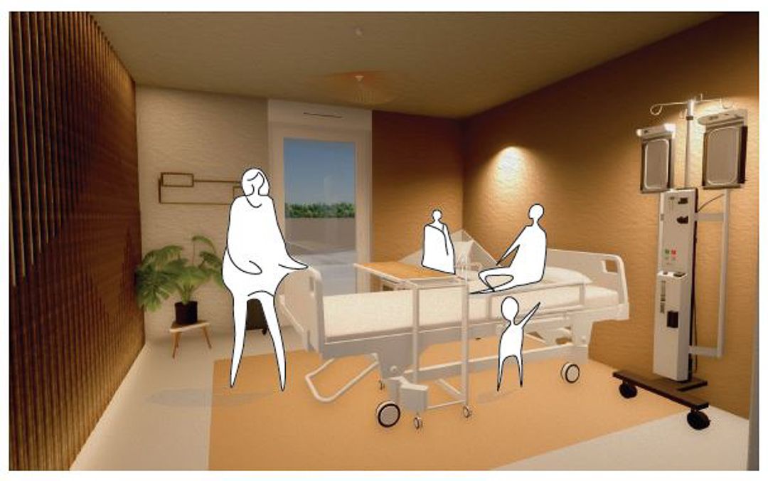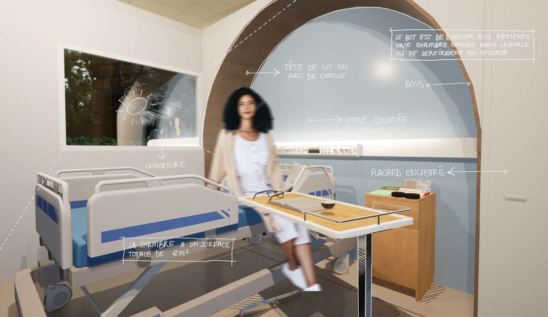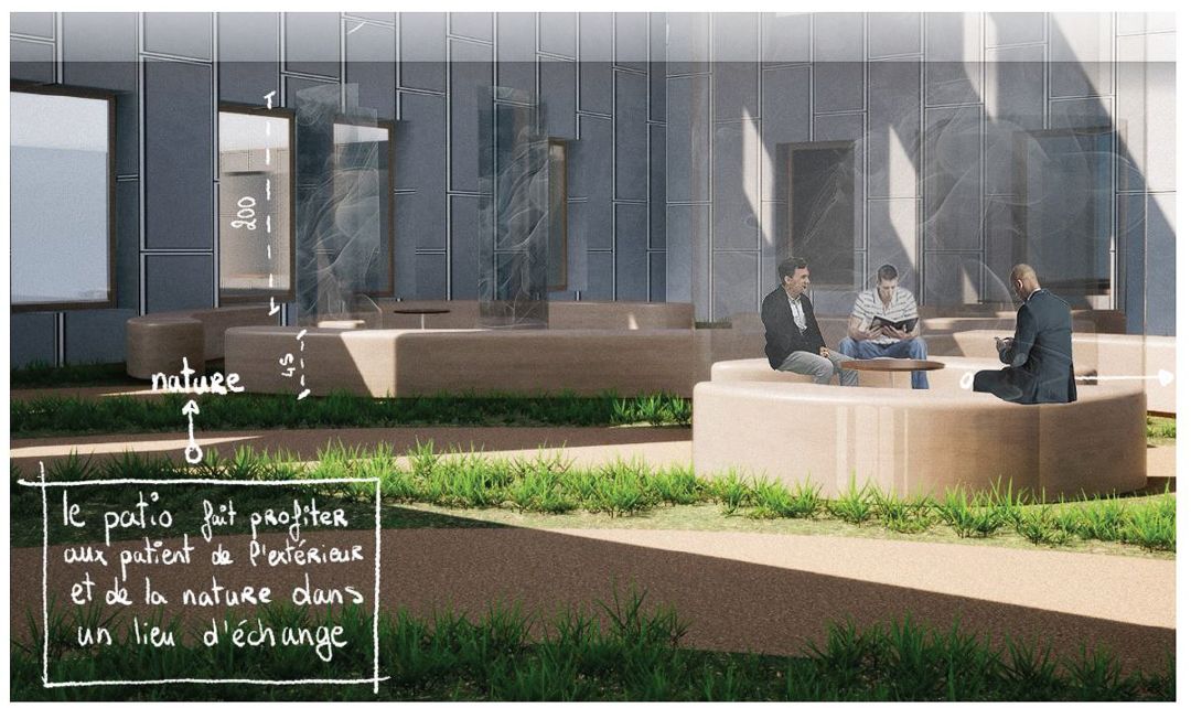 Ainsi, le projet mené par les étudiants s’articule autour de deux typologies d’espaces : l’espace intime de la chambre de patient et l’espace collectif des zones d’accueil et de rencontre, tels que le patio ou les salles d’attente. Ils ont été chargés de développer un concept qui fusionne ces deux dimensions, en tenant compte des attentes, avantages et contraintes propres à chaque type d’espace.