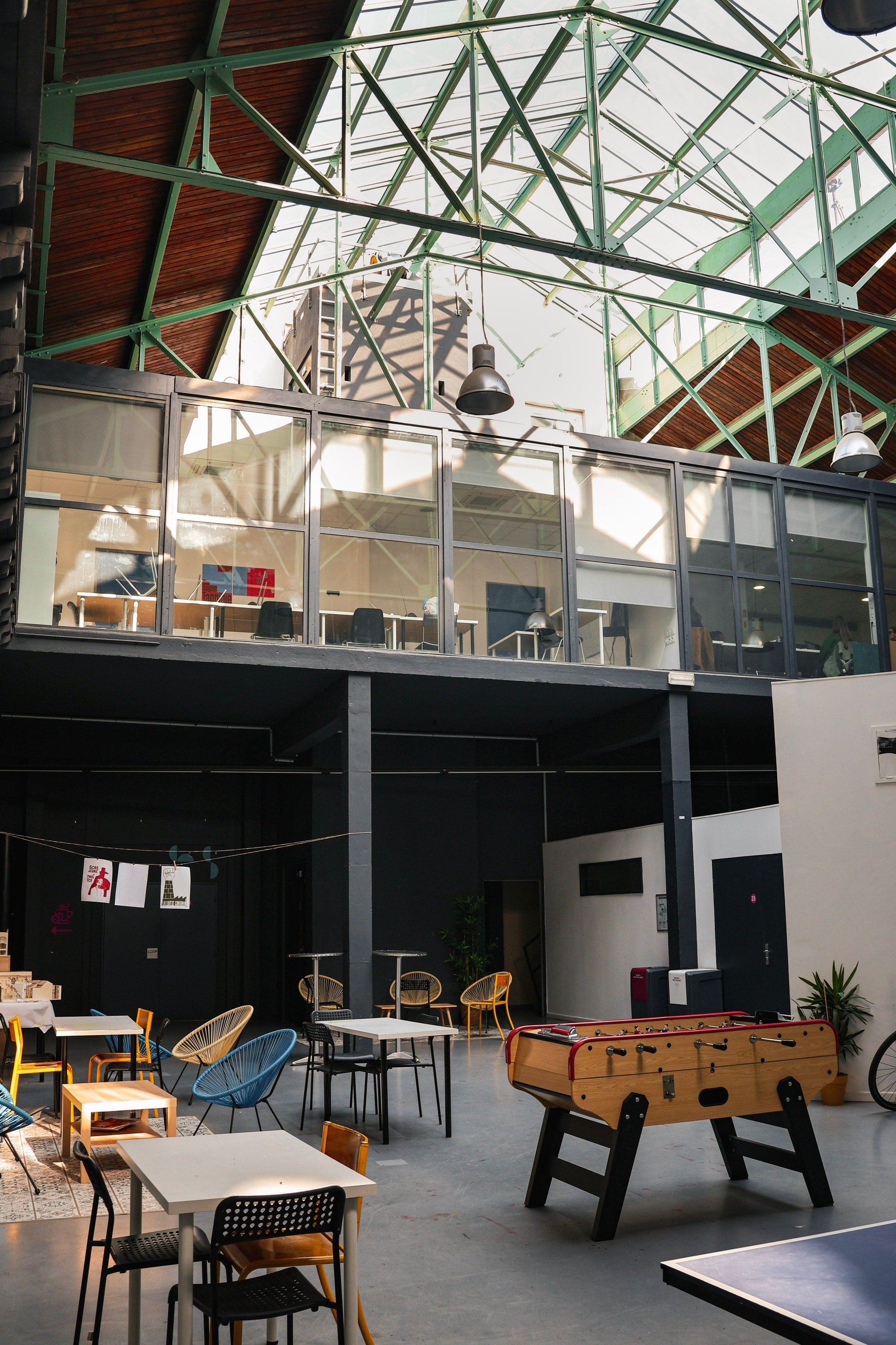Les grands halls aménagés des deux bâtiments sont conçus pour le travail collaboratif, la détente et l'accueil d’événements. Ces espaces polyvalents contribuent activement à la dynamique artistique et à la convivialité du campus.
